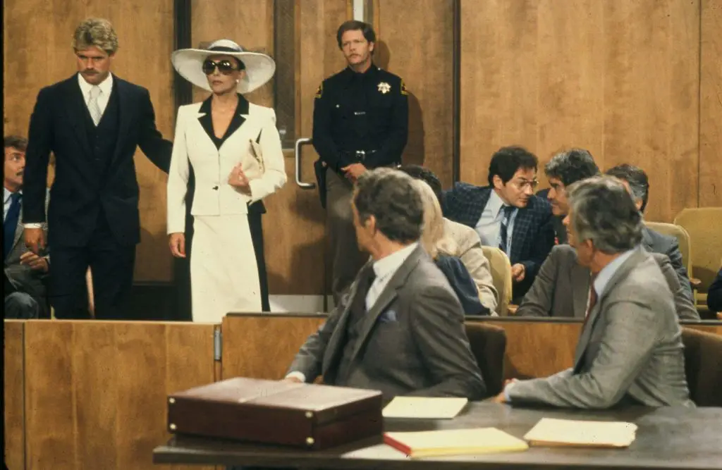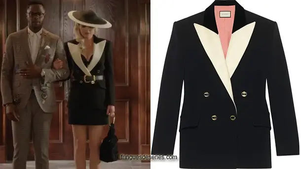 Alexis Carrington (Eliane Hendrix) débarque comme témoin au procès de Blake dans un magnifique manteau npir et blanc signé Gucci que l’on trouve ici ou ici.