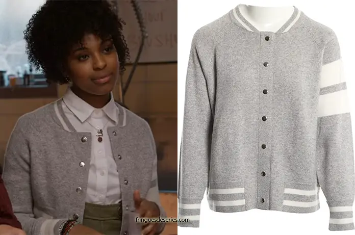 Dans 13 Reasons why 4×03, Ani (Grace Saif) porte ce ravissant cardigan dont le style rappelle un blouson teddy. On le trouve ici.