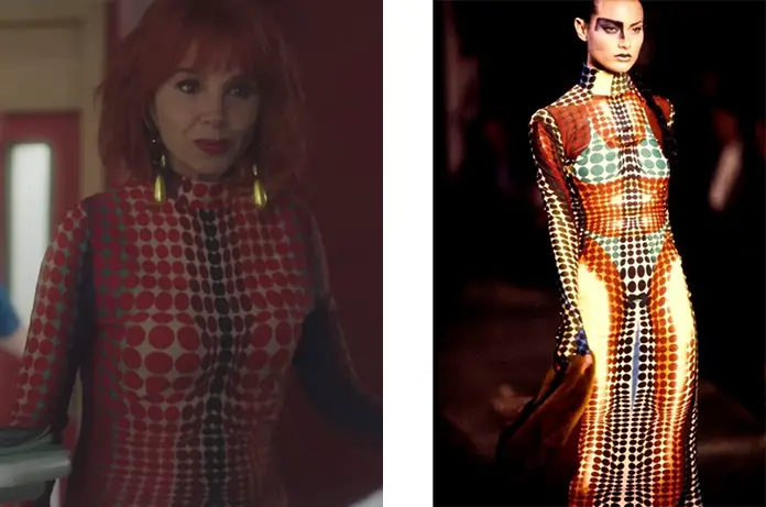 Pour le grand final de son arche narrative, Rebecca (Victoria Abril) a choisi une robe de couturier, une création Jean-Paul Gaultier pour la collection automne 1995. Un modèle que l’on trouve sous le nom de Mad Max Vasarely, on comprend pourquoi. Cette robe, également portée par Camille (Elisa Ezzedine) provient de la garde-robe personnelle de Victoria Abril. On le sait, Jean-Paul Gaultier est un habitué des collaborations avec Pedro Almodovar. Pour l’anecdote, les scénaristes ont imaginé une dernière allusion au cinéaste espagnol en faisant dire à Rebecca « Attache-moi » à l’infirmier.