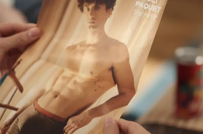 Il s’agissait d’une campagne de lingerie « Joli paquet » pour le marché japonais (nous n’avons pas recherché la marque du boxer). Le jeune homme ne vas pas manquer de se faire chambrer par sa fratrie.
