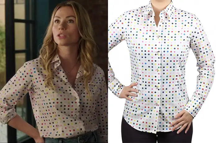 Jul (Maud Baecker) porte cette jolie chemise à pois multicolores dans L’Amour presque parfait, diffusé sur France 2. Cette chemise de la marque Coton doux est sold out. On en trouve de similaires dans la même marque ici.