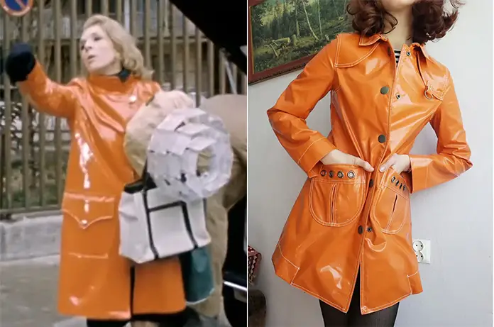 On adore ce manteau en vinyle orange, matière très à la mode à l’époque (nous sommes en 1968), popularisée par Pierre Cardin ou André Courrèges.
