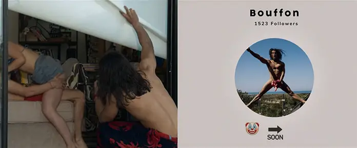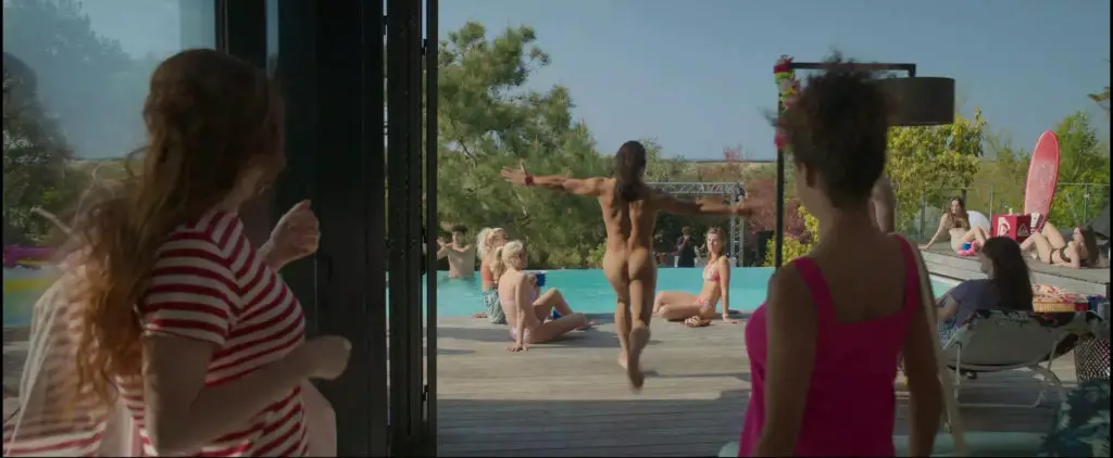 On vous proposait ici la chemise de Julius (Julien Lopez) dans les Liaisons dangereuses de Rachel Suissa (Netflix), mais les premières apparitions du personnage dans le film sont un peu plus défringuées… On le voit ainsi sortir tel un dieu marin des flots après sa séance de surf, torse nu, pectos saillants… Et pire encore, c’est complètement nu qu’il fait un plongeon dans la piscine de Tristan Badiola lors de la fête de pré-rentrée.