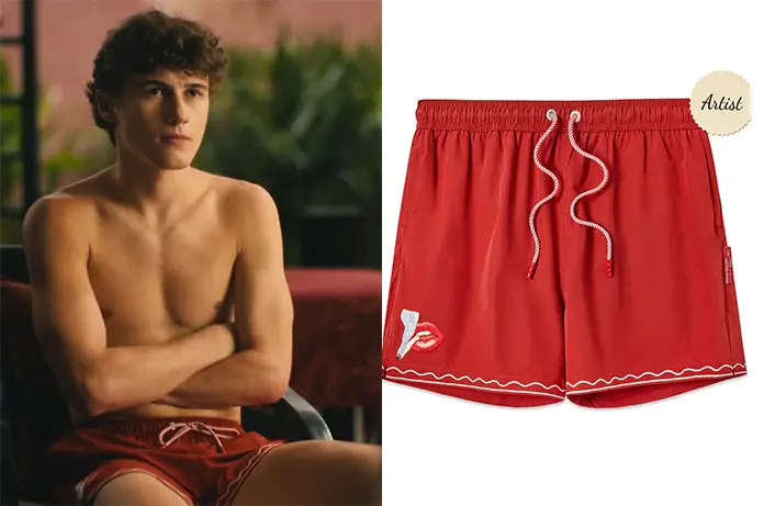 Lochlan (Sam Nivola) porte un short de bain rouge dans The White Lotus 3×03.