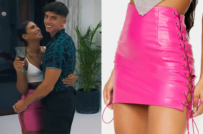 Dans Séduction haute tension (Too hot to handle), sur Netflix, Emily enlace Cam et porte une mini jupe en faux cuir rose flashy.