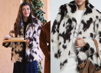 Bianca (Alexandra Ferreira) apporte le gouter dans Ici tout commence épisode 1322. Elle a choisi un manteau en fausse fourrure imprimé vache, disponible ici.