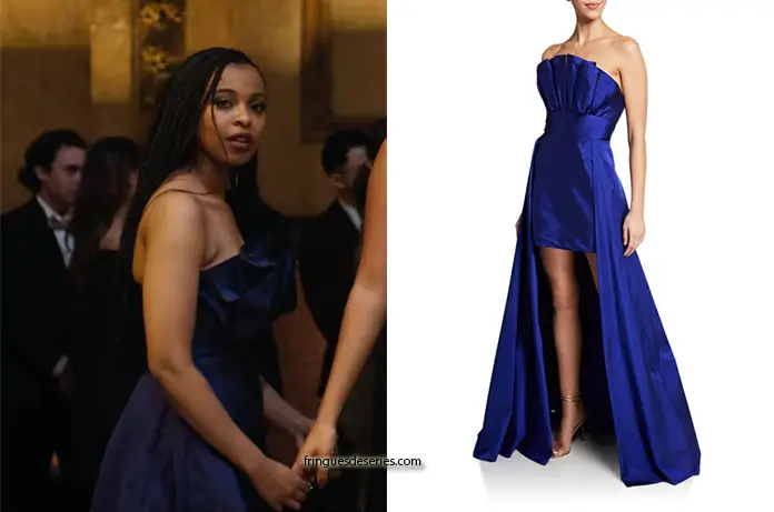 Invitée au bal de promo dans 13 Reasons why 4×09, Ani (Grace Saif) avait mis une robe bleue, mini, rehaussée d’une longue jupe de dessus ouverte. On la trouve ici