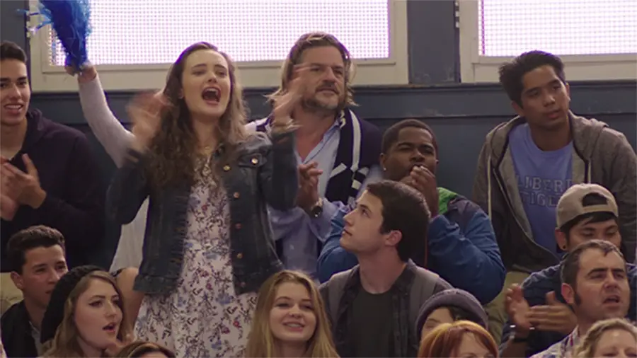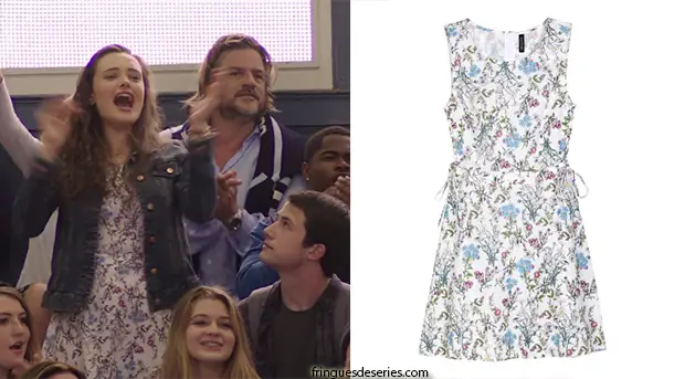 Hannah Baker (Katherine Langford) assiste à un match de basket du lycée avec une petite roble à fleurs H&M, en soldes actuellement, dans le premier épisode de 13 reasons why.
