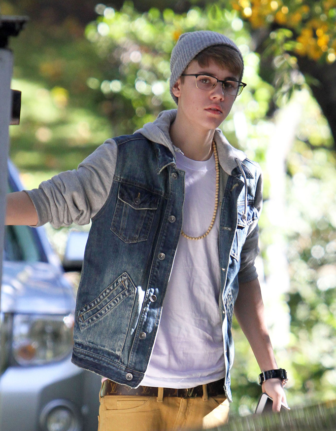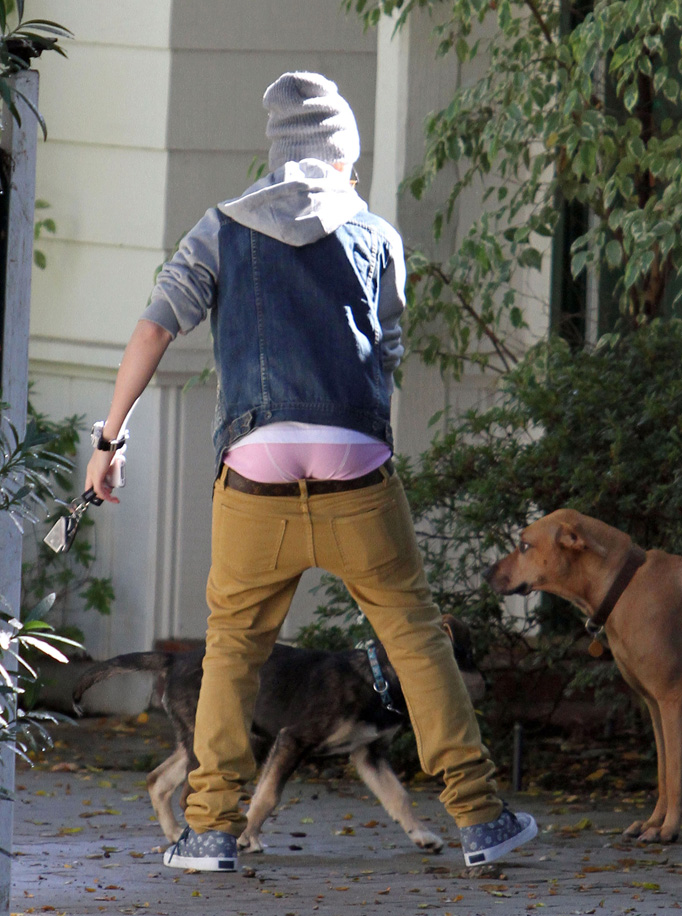 La soirée s’est terminée de manière beaucoup plus rigolote pour Justin, puisqu’il s’est déchainé sur scène dans un look totalement improbable…, faisant le fou avec le groupe LMFAO (voir vidéo…à la fin, le groupe est rejoint par David Hasselhof et Keenan Cahill, qui n’ont pas hésiter à tomber le pantalon)… Le gars n’a pas peur du ridicule, ce qui le rend assez sympathique…On le retrouve le lendemain, parti déjeuner au iHop de Sherman Oaks (Los Angeles) ou encore promener son chien… Là, on a affaire au Justin traditionnel, chino moutarde, bonnet gris…et son traditionnel caleçon American Apparel rose.