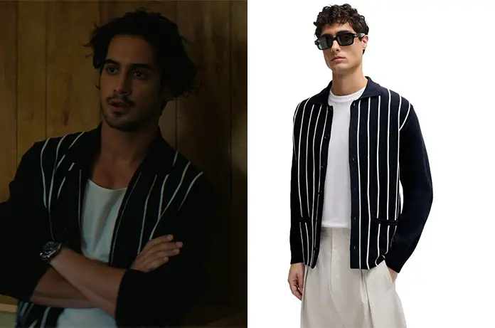 Dans 56 Days épisode 2, quand Oliver (Avan Jogia) se rend chez Ciara pour la première fois, il porte ce cardigan à rayures. Il s’agit du modèle Tripoli de Boss. Une pièce sold out.