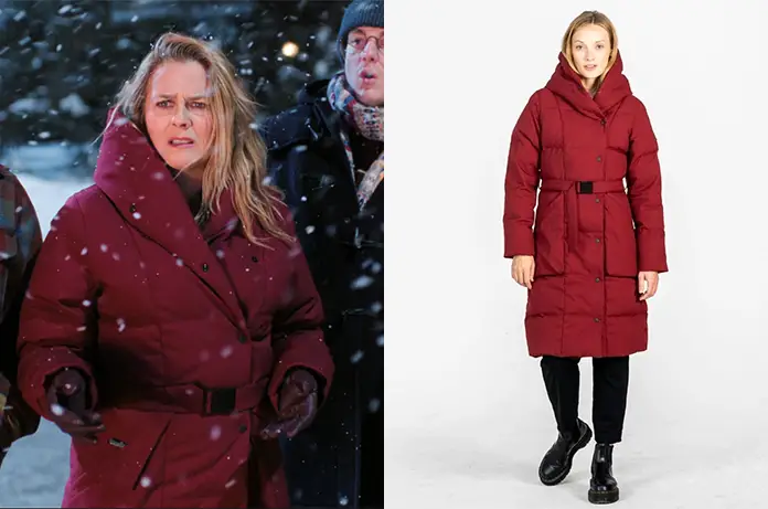 Quand elle va chercher son sapin, elle porte une parka vert olive. Il s’agit du modèle Lorette de Canada Goose. On le trouve sur des sites de seconde main, comme ici