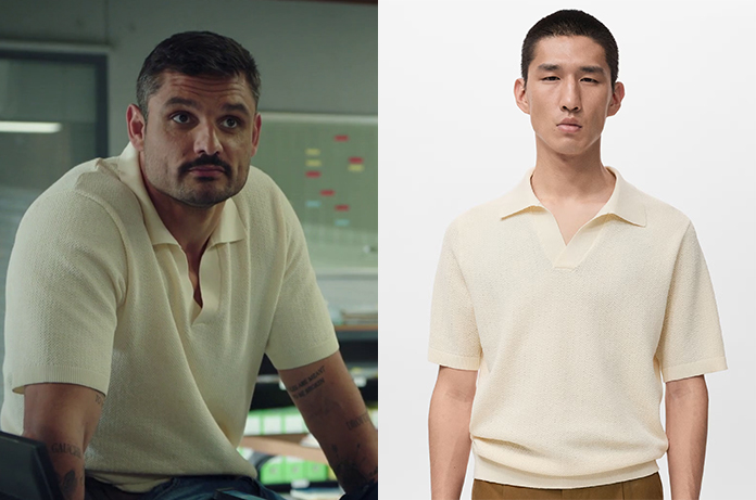 Jean-Mathieu « Jim » Alberti (Florent Manaudou) est à l’aise pour enquêter dans A Priori 2×01. Le nouveau capitaine porte un polo écru à maille.