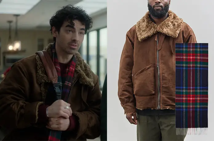 Joe se présente à l’aéroport avec cette veste marron au col fourré. Un bomber de la marque Engineered Garments.