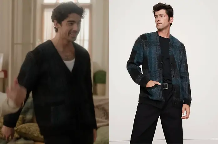 A la fin du film, il fête Noël avec ce cardigan dans les tons bleus, de Banana Republic. Sold out.
