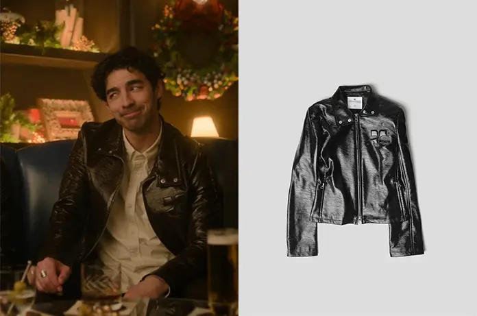 Il a choisi également une veste de biker noire, au logo reconnaissable sur la poitrine. Une veste Courrèges dispo ici