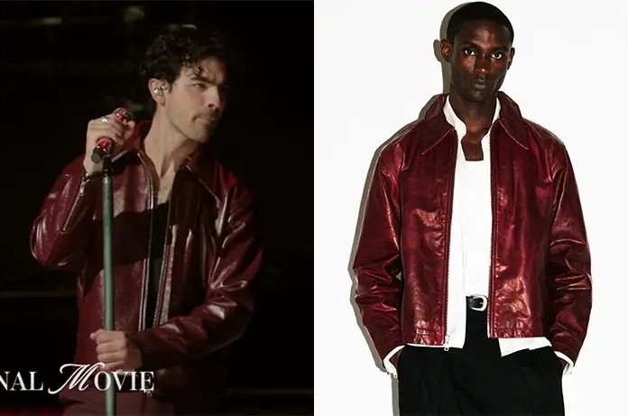 D’abord ce blouson en cuir rouge qu’il porte pour le concert de Noël : il est dispo ici