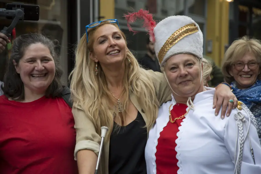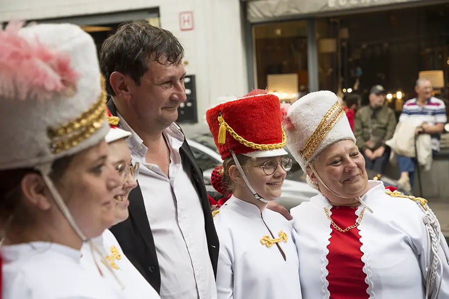 A 18 heures, des géants et des majorettes sont venus animer la rue Blaes pour fêter l’ouverture de Mes Découvertes, le nouvel espace de Julien. Le spectacle a d’ailleurs particulièrement plu à Sophie Davant, qui n’a pas hésité à se joindre aux filles pour la photo souvenir.