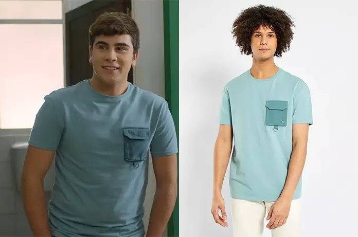 Dans l’épisode 1×13 d’Ag3nda (Di4ri), Damiano (Santiago Narciso) porte ce t-shirt bleu turquoise. Il s’agit d’un ancien modèle Kiabi