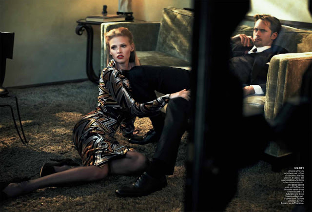 Alexander Skarsgård qui a, en ce moment, des problèmes de mémoire dans la saison 4 de True Blood apparaitra bientôt sur nos grands écrans puis qu’il joue dans le film Melancholia de Lars Von Trier (sortie franco-belge le 10 août). Il est l’objet également d’une sessio photos pour le magazine Vogue US de juillet. L’article est intitulé Spellbound, rappelant le thriller éponyme d’Hitchcock (1945). Les photos sont signées Peter Lindbergh. Les modèles qui accompagnent Alexander sont Lara Stone et Frida Gustavsson.