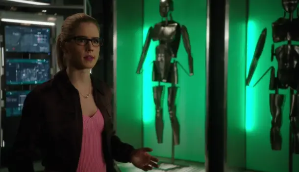 Felicity (Emily Bett Rickards) portait ce petit bomber Club Monaco tout court de couleur bordeaux dans le 16e épisode de la saison 5 d’Arrow.
