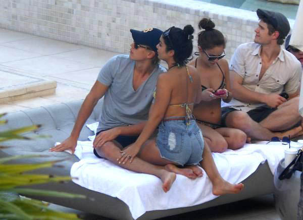 Vous le savez, Austin Butler et Vanessa Hudgens ont décidé de passer le cap de l’an à Miami, à l’Hôtel Fontainebleau. ET hier encore, ils s’amusaient au bord de la piscine. Et on voit aussi qu’Austin apprécie la marque All Saints , puisqu’après un t-shirt Not For Sale, il portait un t-shirt de cette marque. Mais il n’y a pas que le port du t-shirt qui procure du plaisir au jeune homme puisqu’il semble que les mamours publics offerts par sa belle lui fassent, à en juger par les clichés, pas mal d’effets. (voir les photos après le saut)