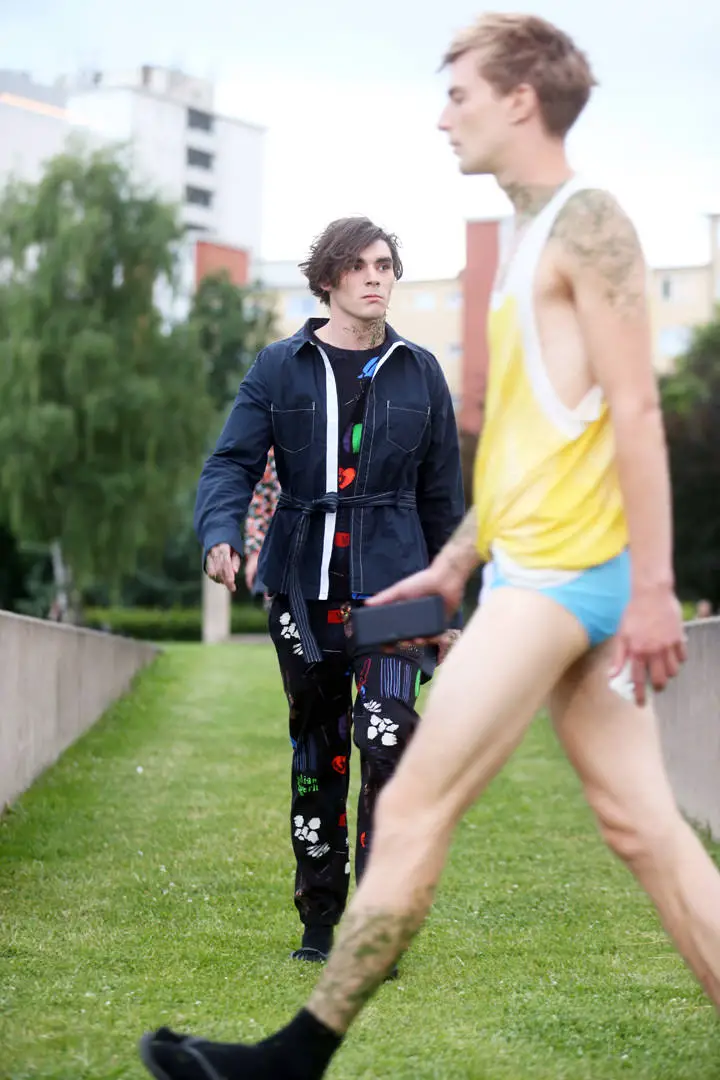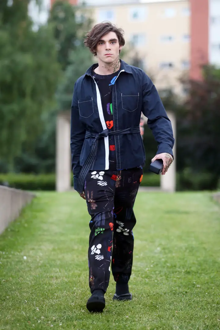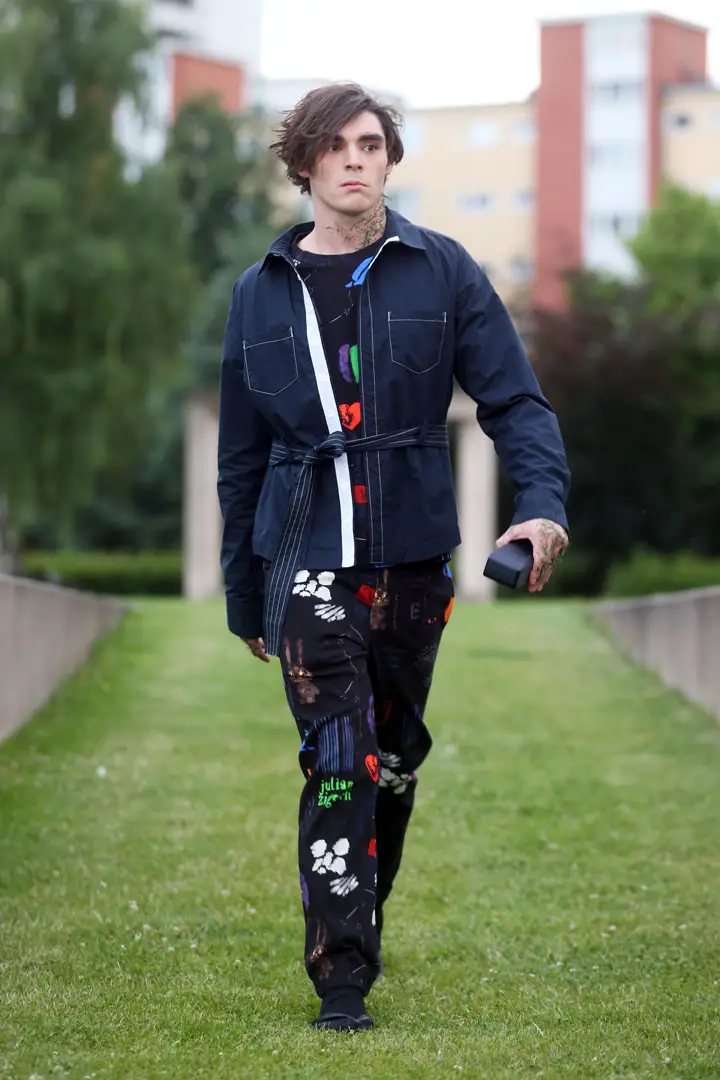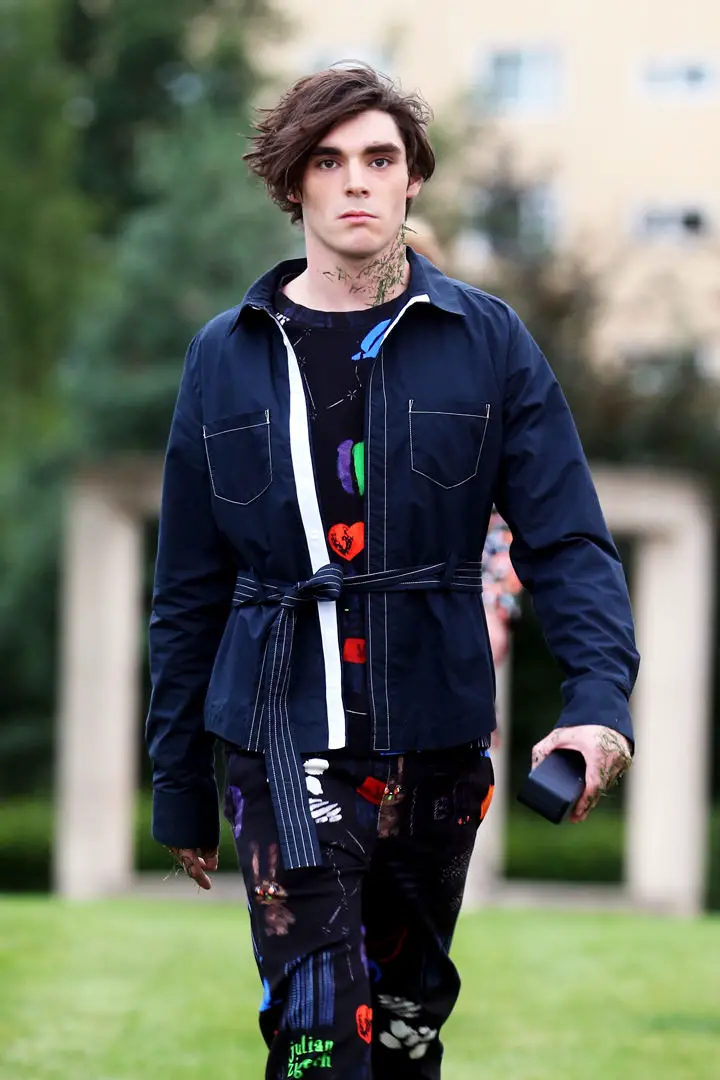 Hier soir, le styliste suisse Julian Zigerli présentait sa collection White rabbit à la fashion Week de Berlin. Parmi les modèles, on reconnaissait RJ Mitte. Non, ce n’est pas un nouveau tatouage que RJ porte dans le cou, mais des brins de gazon. Le maquillage ‘pelouse’ était un des fils conducteurs du défilé : dans le cou, sur l’épaule, le mollet… Une idée pour l’été prochain.