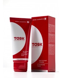 D’abord un gel pour se nettoyer le visage (évitez le savon sur le visage !) de la marque suisse TASK.