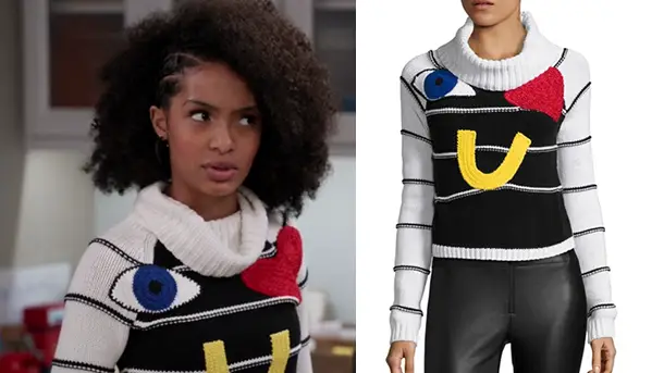 Great turtleneck sweater for Zoey (Yara Shahidi) in Black-ish, season 3, episode 20. Black and white with big eye, large heart and U motifs. It’s an Alice+Olivia sweater you can find here.