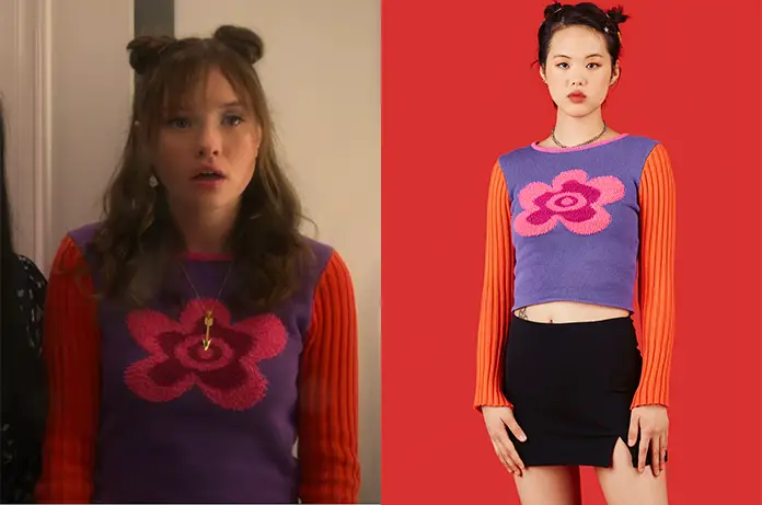 Gia (Zoe Margaret Colletti) va à la fête, dans Boo, Witch 1×01, dans ce pull très pop, avec une grosse fleur rose au centre.