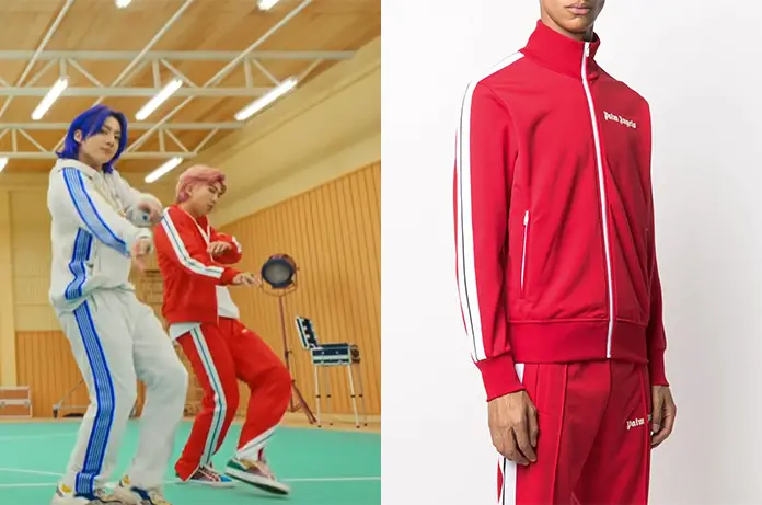Dans le même clip, il porte aussi un survêtement rouge, avec le logo sur la poitrine et la cuisse. On y lit Palm Angels. On le trouve ici