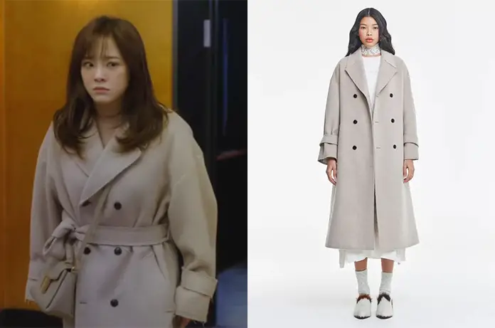 Ha-Ri ( Kim Se-Jeong) porte ce beau et qualitatif trench coat en laine, très classique, dans Business Proposal 1×01 (Netflix). On le trouve ici.