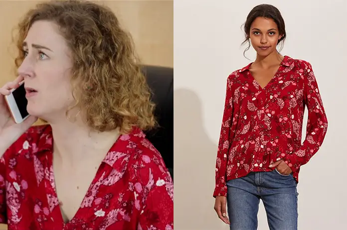 Frédérique Koehler (Joséphine de Meaux) porte cette chemise rouge avec un imprimé floral dans César Wagner 1×07.