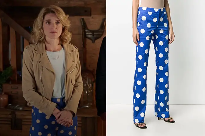 Élise (Olivia Côte) mène l’enquête dans César Wagner 1×06 (L’Œil du lynx) avec ce pantalon bleu à gros pois.