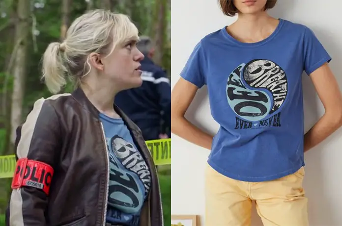 Léa (Coralie Russier) débarque sur le lieu du crime, dans César Wagner 1×06 (L’Œil du lynx), diffusé sur France 2, avec ce t-shirt bleu, avec l’inscription Deep breathe. Il est de la marque Leon & Harper.