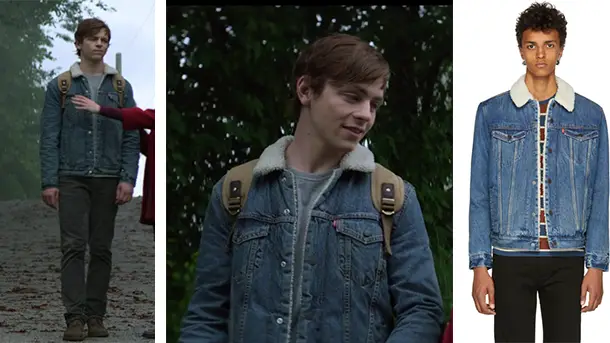 Harvey Kinkle (Ross Lynch) portait une veste en denim et col fourré dans le premier épisode de Les nouvelles aventures de Sabrina. On le trouve ici.