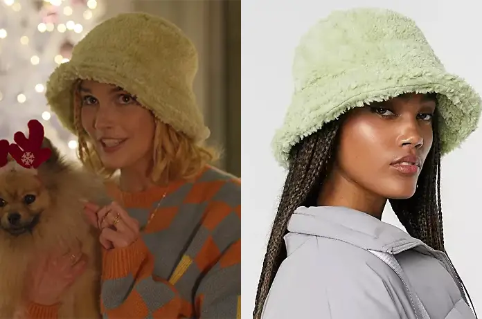 Mel (Camille Lou) porte un bob vert en fausse peau de mouton dans le premier épisode de Christmas Flow, diffusé sur Netflix. On le trouve ici