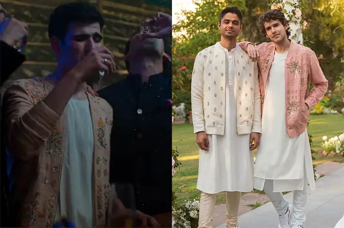 Jenjum Gadi est sans doute plus dans la tradition. Il est très connu en Inde, non seulement pour avoir créé des costumes militaires, mais aussi pour habiller des stars bollywoodiennes comme Sonakshi Sinha, Arjun Kapoor et Milind Soman. Aujourd’hui, il se consacre à la mode masculine. Il a donc habillé Dhruv (Chayab Chopra) de cette séduisante veste rose, conçue d’ailleurs pour des garçons d’honneur à un mariage.
