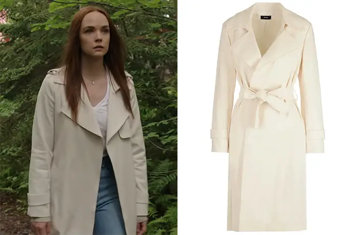 Lorsqu’elle arrive pour la première fois dans les paysages verdoyants de la Nouvelle-Écosse, Maggie porte un trench-coat crème d’une élégance classique. Cette pièce symbolise parfaitement son statut de citadine accomplie qui tente de naviguer dans un environnement beaucoup plus brut. Il s’agit peut-être d’un trench Theory, le modèle Oaklane que l’on voit souvent dans les séries. Le manteau de Maggie a, cependant, des pattes d’épaule.