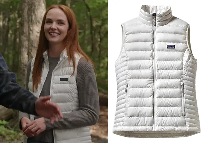 Une fois installée et prête à affronter l’air frais de la forêt, Maggie adopte l’uniforme local, mais sans sacrifier son sens du style. On la retrouve avec une veste matelassée sans manches (down vest) qui devient vite sa meilleure alliée pour ses retrouvailles avec la nature (et Cal Jones !). On la trouve ici