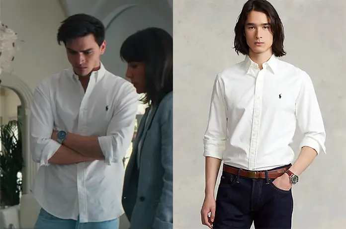 Il porte aussi une chemise blanche, col boutonné, avec un logo bien identifiable. On la trouve ici