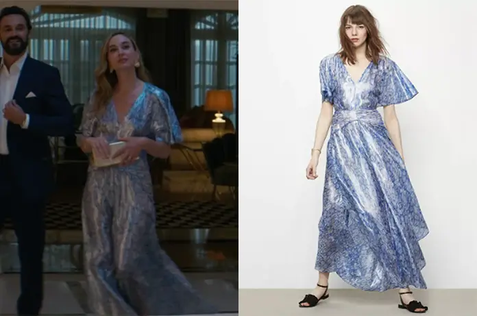 Rafaella (Marta Hazas) porte cette robe bleue avec fils métalliques. Il s’agit du modèle Rolls de la marque Maje, qui remonte à quelques années.