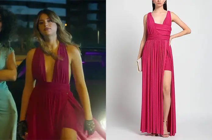 La robe fuchsia très sexy est un modèle customisé de la marque Liu Jo, encore dispo ici.