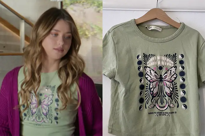 On l’aperçoit aussi furtivement avec ce t-shirt papillon, un modèle Pull& Bear