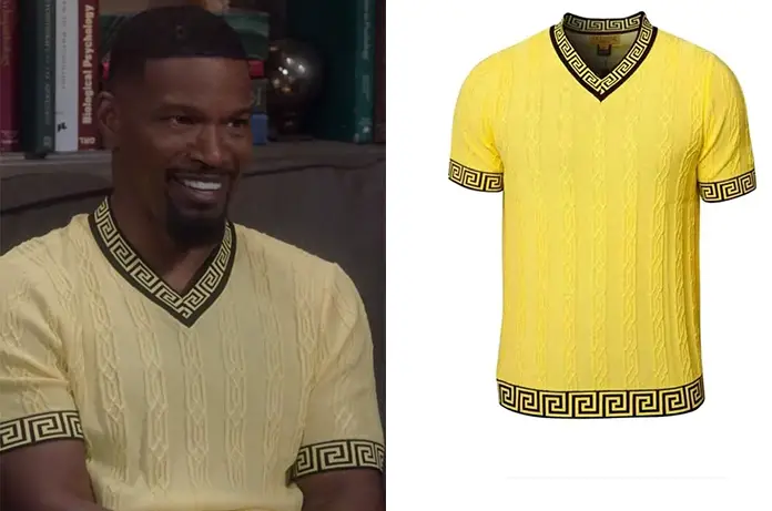 Brian (Jamie Foxx) revient dans une sitcom, sur Netflix, Dad Stop Embarrassing Me! (Arrête papa, tu me fais honte !). Dans le premier épisode, il se renbd chez la psy avec ce polo canari que l’on trouve ici.