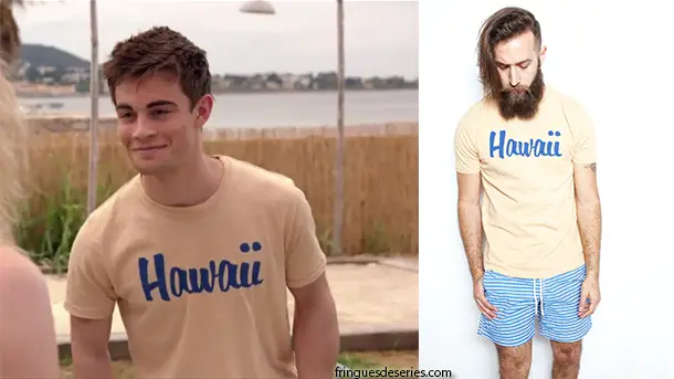 Maxime Delcourt (Clément Remiens) continue à épuiser le catalogue Hartford. Dans l’épisode 10 de Demain nous appartient, il porte un t-shirt avec la mention Hawaii.