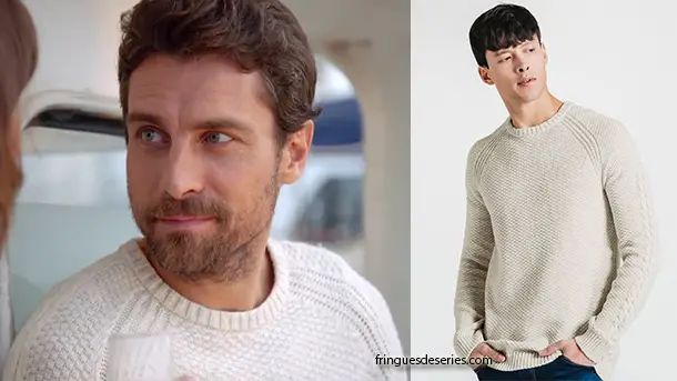 Joli pull écru aux manches torsadée pour Thomas Delcourt (Cyril Garnier) dans l’épisode 103 de Demain nous appartient. On le trouve chez Jules.