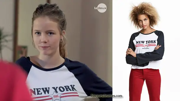 Margot (Marysole Fertard) se retrouve seul avec Maxime dans l’épisode 132 de Demain nous appartient. Elle porte un t-shirt H&M « New York » disponible ici.