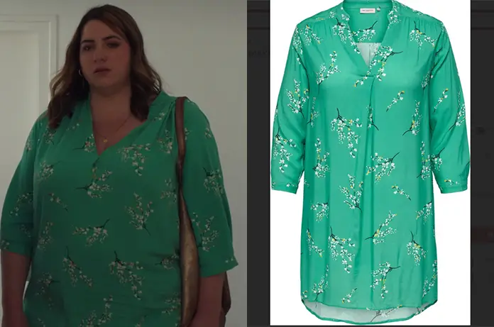 Audrey (Charlotte Gaccio) semble au bout du rouleau dans Demain nous appartient 1205. Elle porte une robe tunique verte de la marque danoise ONLY Carmakoma