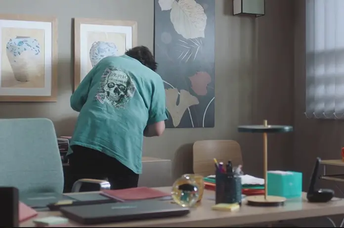 Mona (Catherine Benguigui) s’installe comme proviseure dans Demain nous appartient 1020. Elle porte une blouse verte avec une belle tête de mort dans le dos. Elle est de Luck and Cie.