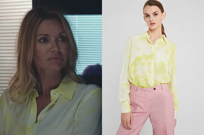 Chloé est encore convoquée au commissariat de Sète dans Demain nous appartient 971. Elle a décidé de porter une blouse tie and dye jaune. On la trouve ici
